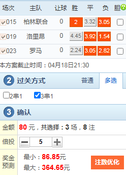 之前基本上都是单选,但小编发现实际胜率并不高,所以经过酝酿小编开始换一种玩法,以全双选的方式谋求过关。赛季尾声阶段不少比赛双选比较清晰,因而有可能过关几率较高,尝试一把。