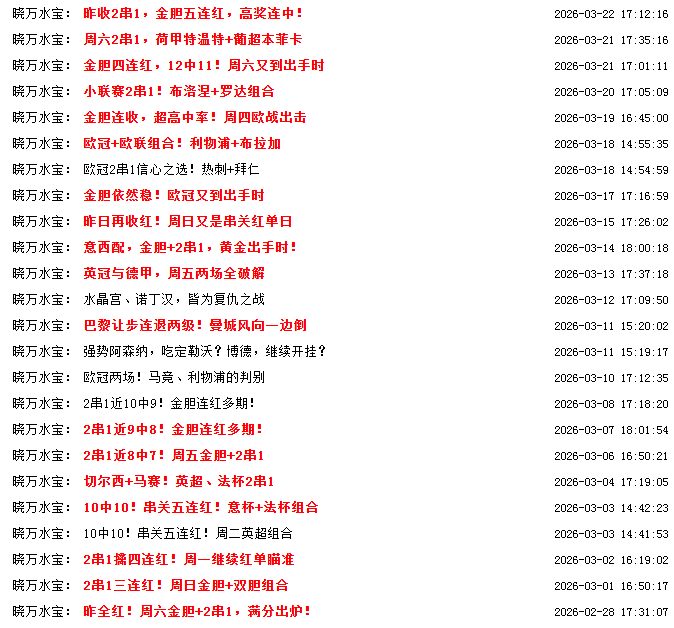 在年后晓万水宝在本站(www.maicai.cn)的推荐一度有失水准,但经过了多期调整重回胜轨,自2月27日开始至今,一共推出26串2串1,仅仅有6次失手,胜率高达76%!3月18日至3月22日一共提供了6次2串1,全部红单,实现了六连红!今日最新2串1出炉:巴西VS法国+玻利维亚VS苏里南。详情请登录查询。https://www.maicai.cn/news_list.php?t=325&d=325001&page=1